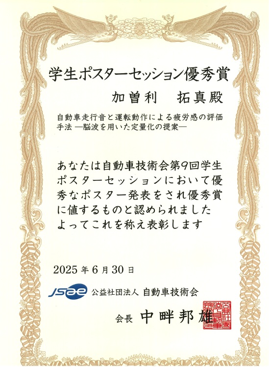 精密工学専攻の加曽利拓真さんが自動車技術会 2025年春季大会 第9回学生ポスターセッションにて「優秀賞」を受賞