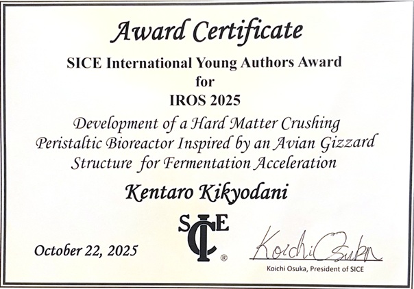 精密工学専攻・中村研究室の桔梗谷健太朗さん(博士前期課程1年)が中国の浙江省杭州市で開催された国際会議IROS 2025(The 2025 IEEE/RSJ International Conference on Intelligent Robots and Systems)にて「SICE International Young Authors Award for IROS 2025(SIYA-IROS 2025)」を受賞し、「IES Student and Young Professionals Paper Assistance Program(IES-SYPA)」に採択されました。